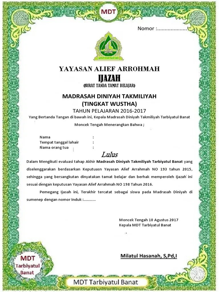 Contoh Ijazah Madrasah Diniyah : Pdf Formulir Madin Pdf Yp Mansyul Ulum Academia Edu : Madrasah diniyah takmiliyah adalah lembaga pendidikan agama islam.